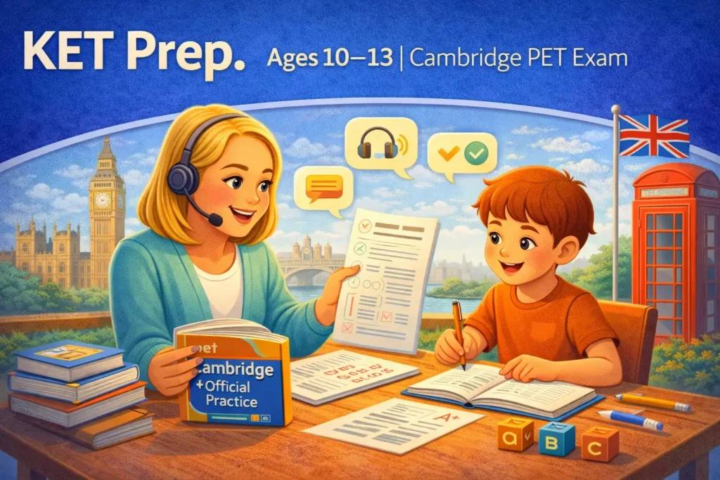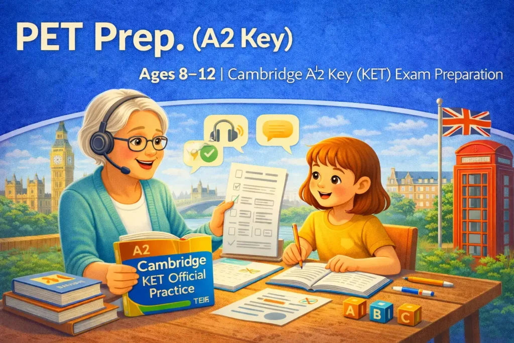 KET Prep is a structured exam preparation course designed for learners preparing for the Cambridge A2 Key (KET) exam. Through focused instruction and guided practice, students work through core KET topics, question types, and language functions, developing accuracy, confidence, and exam readiness.